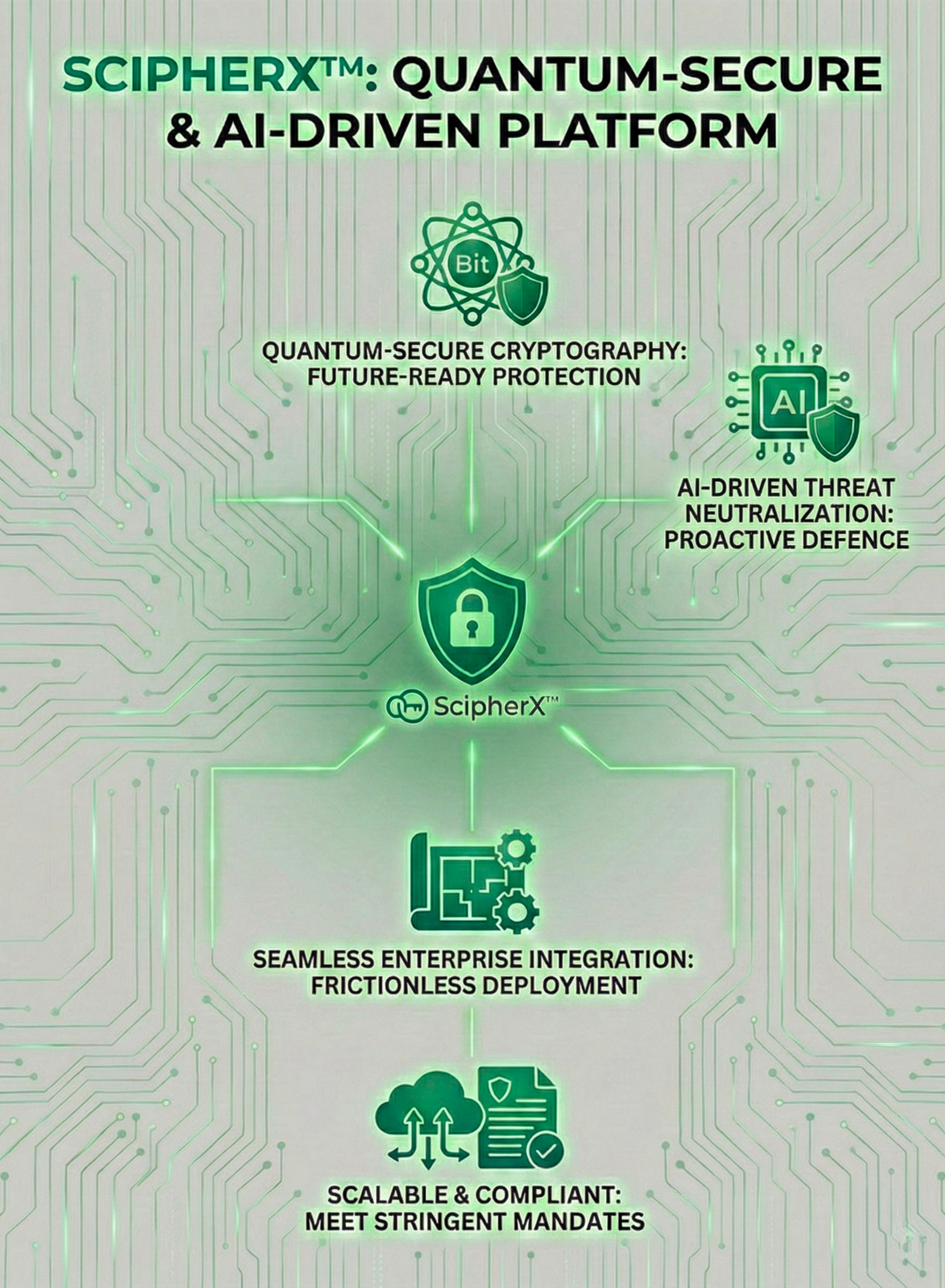 ScipherXTMoffers a quantum-secure cryptography and AI-driven platform that seamlessly integrates into enterprise architecture. This future-ready solution empowers businesses to neutralize evolving digital threats and meet stringent privacy mandates through a scalable, frictionless deployment model.